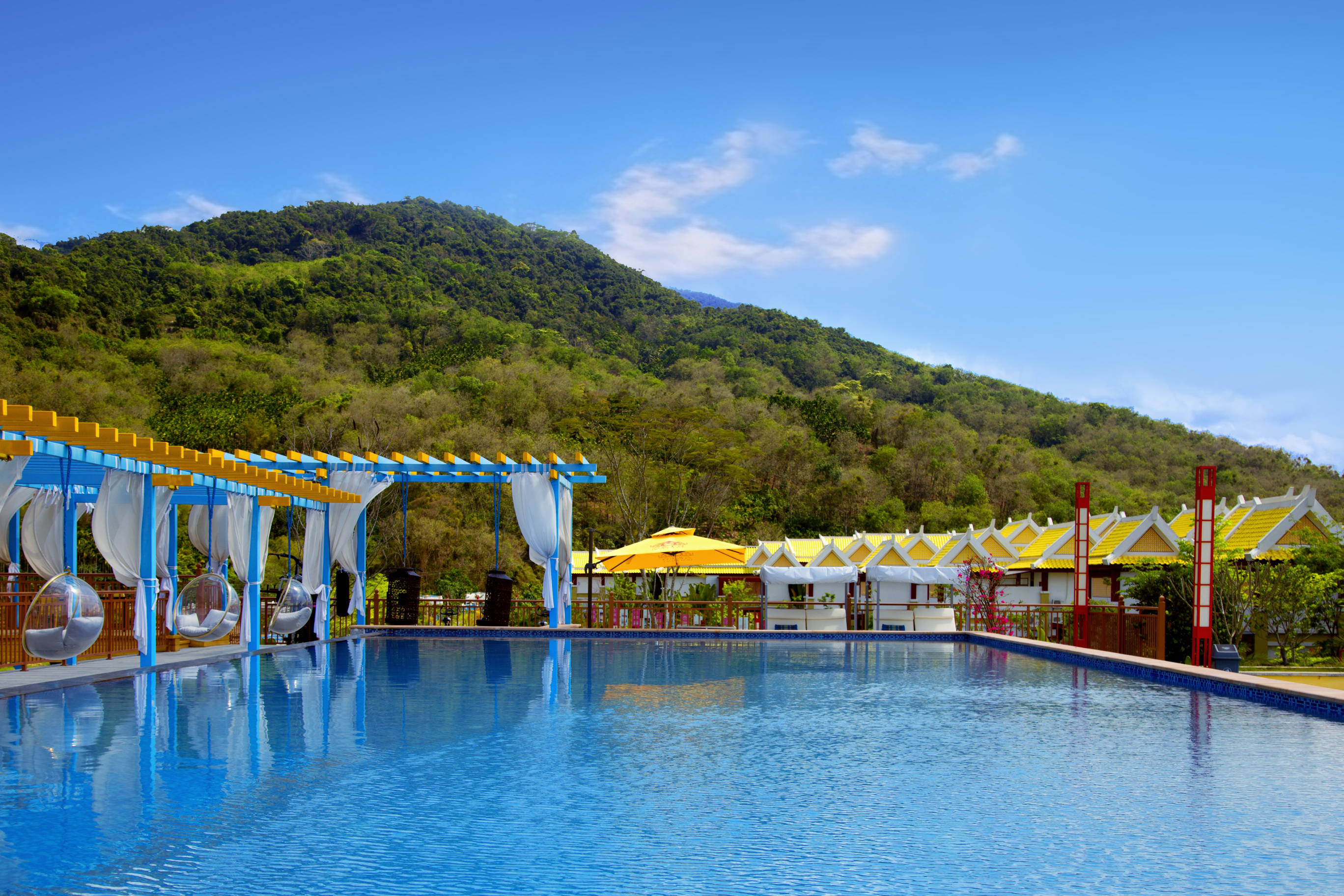 六艺王宫酒店选址于中国热带雨林的核心——海南五指山,紧邻国家热带雨林公园,是一座全新的王宫风格奢华酒店。酒店对山临河,为纯别墅建筑,所有房型均配有专属泳池。